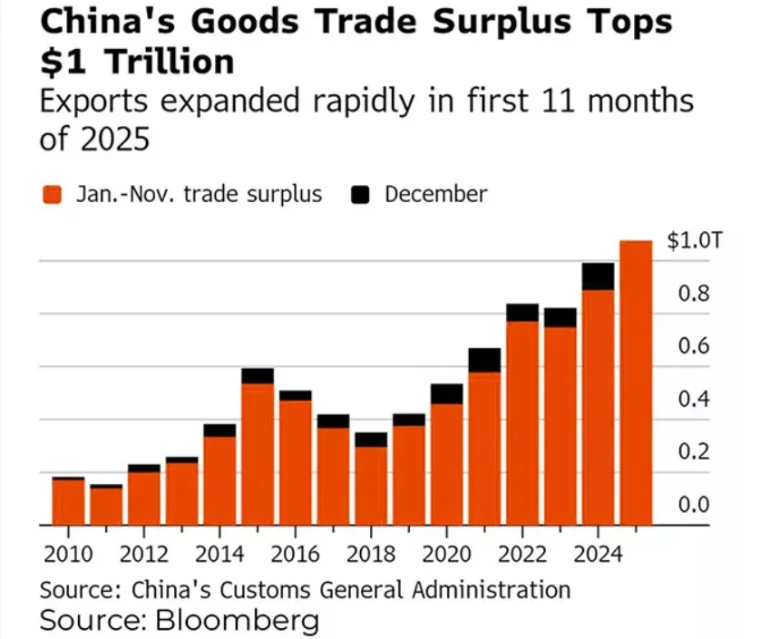 Despite nearly 10 years of United States tariffs imposed during President Donald Trump's administration, China's trade surplus has surged, reaching $1.08 trillion by November - the highest figure ever recorded worldwide and a milestone that China only achieved at the end of last year. This record, revealed by China's customs agency this week, signifies a 21.7% increase compared to the same timeframe in 2024 and highlights China's growing dominance in global exports.
